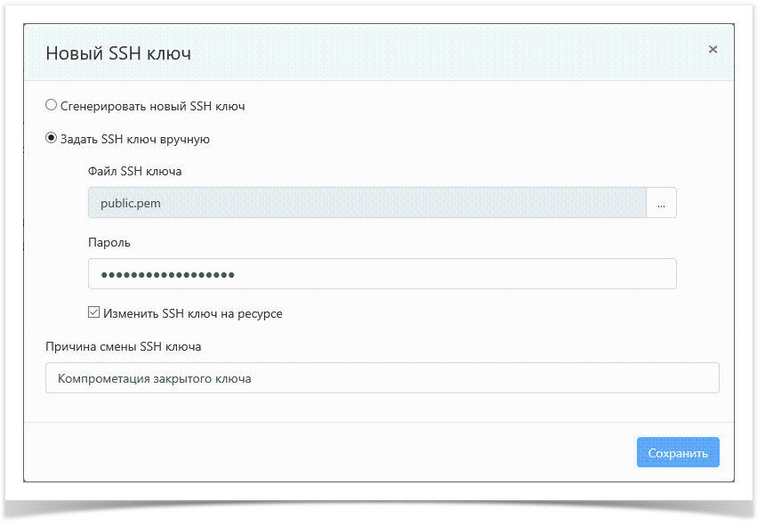 - Заполните поле Причина смены SSH ключа и нажмите Сохранить.