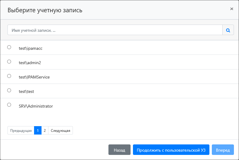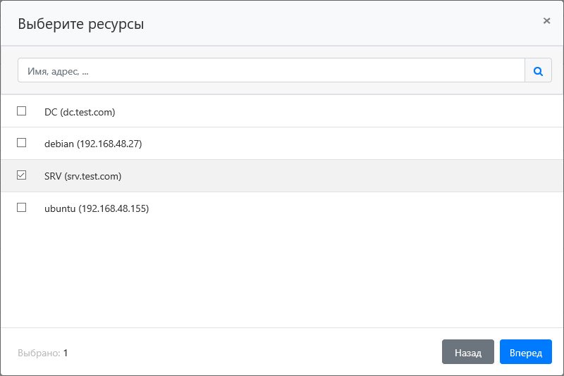Для поиска введите Имя ресурса или Адрес (DNS адрес/IP адрес) полностью или частично.Note icon false Если выбрано более одного ресурса, то для доступа к ним будут использоваться только доменные учётные записи. Если выбран один ресурс, то для доступа к нему будут использоваться как локальные учётные записи, так и доменные.