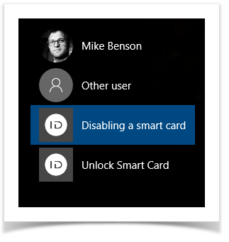 1.To deactivate a card, select Disabling a smart card item in the user selection window. The figure shows an example for Windows 10. The mechanism of smart card disabling in other Windows versions is similar to the one described.