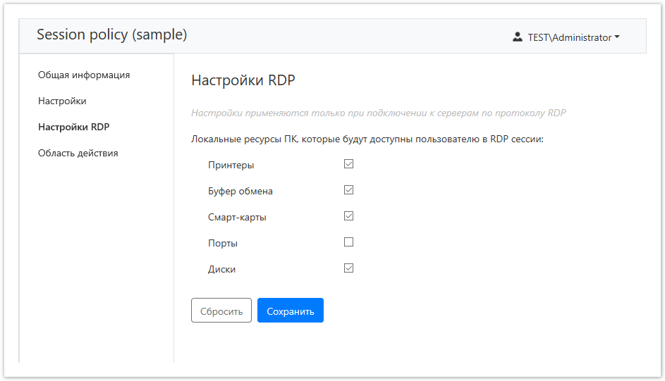 | Диски | Если опция включена, то пользователь получит возможность пробросить локальные диски со своего рабочего места на конечный ресурс. |