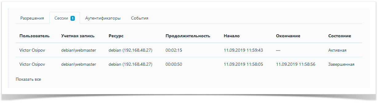 - Ресурс - ресурс, на котором была открыта RDP, SSH или web-сессия от имени учётной записи.