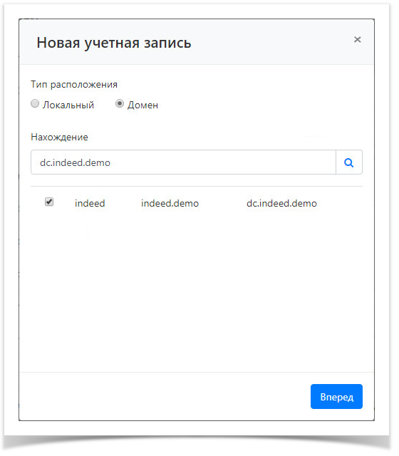 - Выполните поиск, отметьте домен и нажмите Добавить. Домен отображается в формате NetBIOS имя + DNS имя.