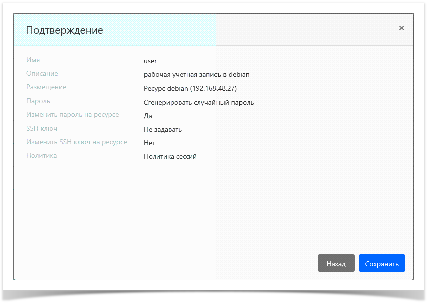 Note icon false Опции Сгенерировать новый SSH ключ или Задать SSH ключ вручную + Изменить SSH ключ на ресурсе могут быть использованы только при наличии сервисного подключения. Если выбрана опция Задать SSH ключ вручную без Изменить SSH ключ на ресурсе, то SSH-ключ учётной записи будет изменён только в Indeed PAM.