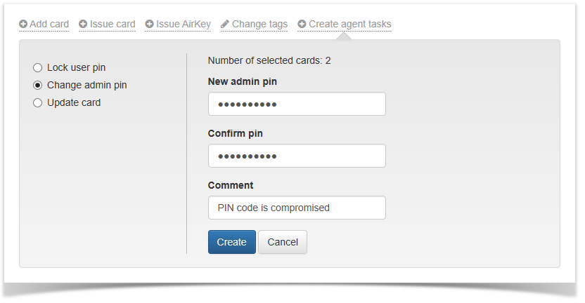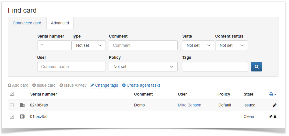 The bulk tasks are then assigned to selected devices and are performed as soon as the devices in question are connected to Indeed CM Agents. To create a bulk task, switch to Cards section, select the necessary devices and click Create agent tasks.