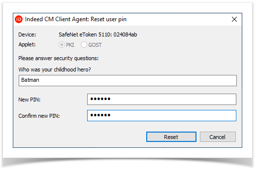 A PIN code can be reset if forgotten by user or blocked. The user has to provide answers to security questions to perform the operation. Make sure that the said questions and answers are defined in Indeed CM Self Service. |