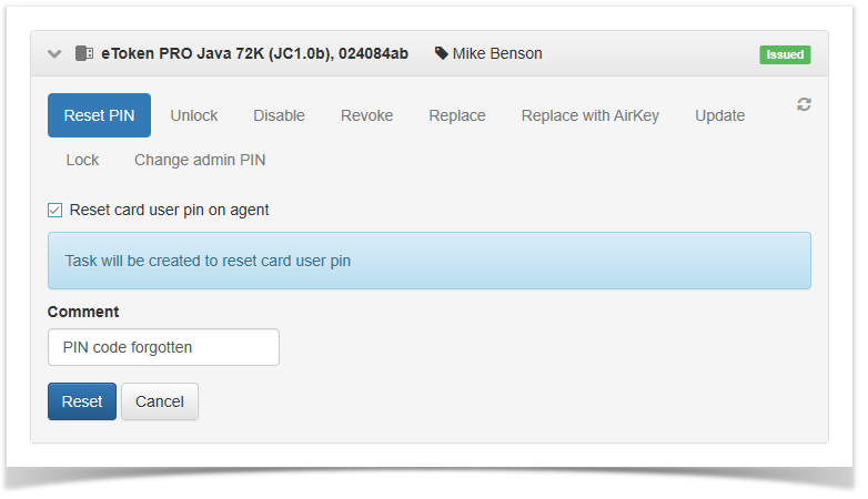 The Agent runs the unlock utility at user workstation while executing the task. The PIN code shall be reset after the user answers the security question, sets a new PIN code and clicks Reset.