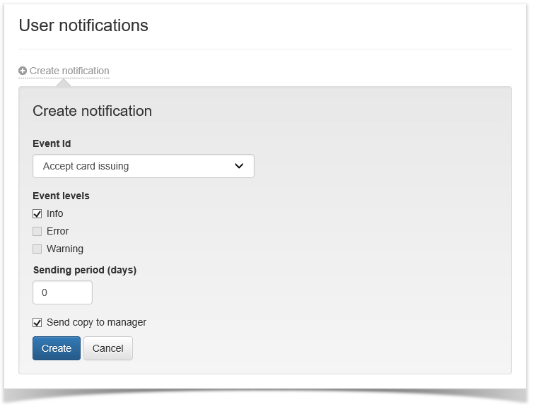 Activate the option of sending a notification of selected event to user manager and If necessary, enable the Send copy to manager option in the selected user event, available only to users located in Active Directory and click Create.