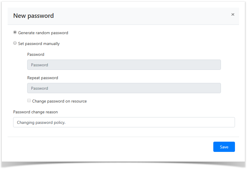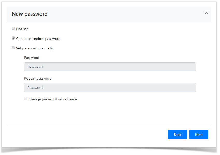 Note icon false Опции Сгенерировать случайный пароль или Задать пароль вручную + Изменить пароль на ресурсе могут быть использованы только при наличии сервисного подключения. Если выбрана опция Задать пароль вручную без Изменить пароль на ресурсе, то пароль учётной записи будет изменён только в Indeed PAM.