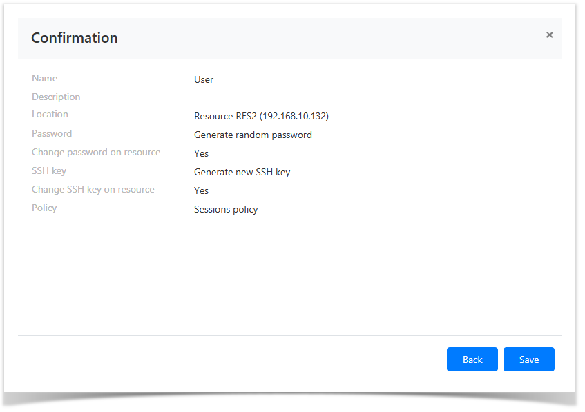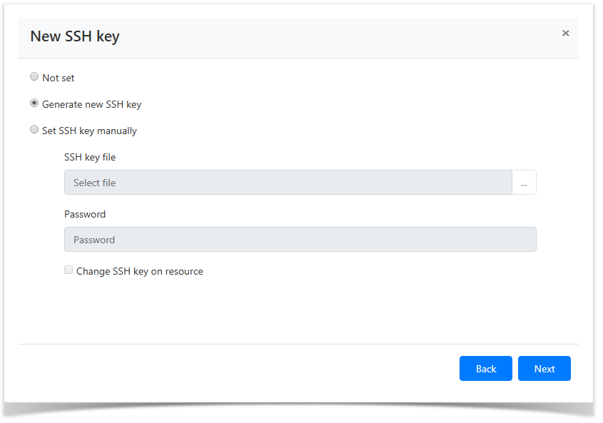 Note icon false Опции Сгенерировать новый SSH ключ или Задать SSH ключ вручную + Изменить SSH ключ на ресурсе могут быть использованы только при наличии сервисного подключения. Если выбрана опция Задать SSH ключ вручную без Изменить SSH ключ на ресурсе, то SSH-ключ учётной записи будет изменён только в Indeed PAM.