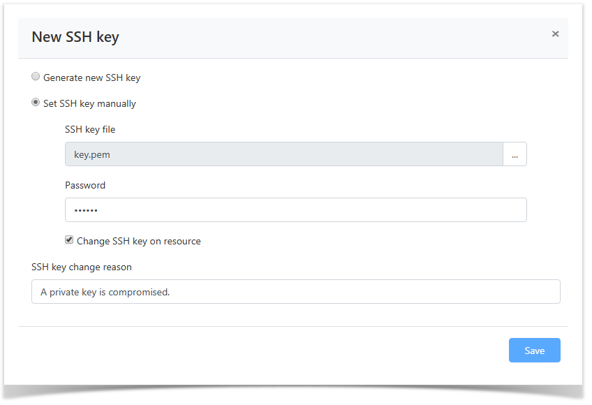 - Заполните поле Причина смены SSH ключа и нажмите Сохранить.