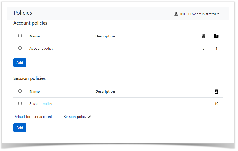 Раздел содержит Политики учётных записей и Политики сессий, позволяет выполнять их просмотр, редактирование, создание и удаление.