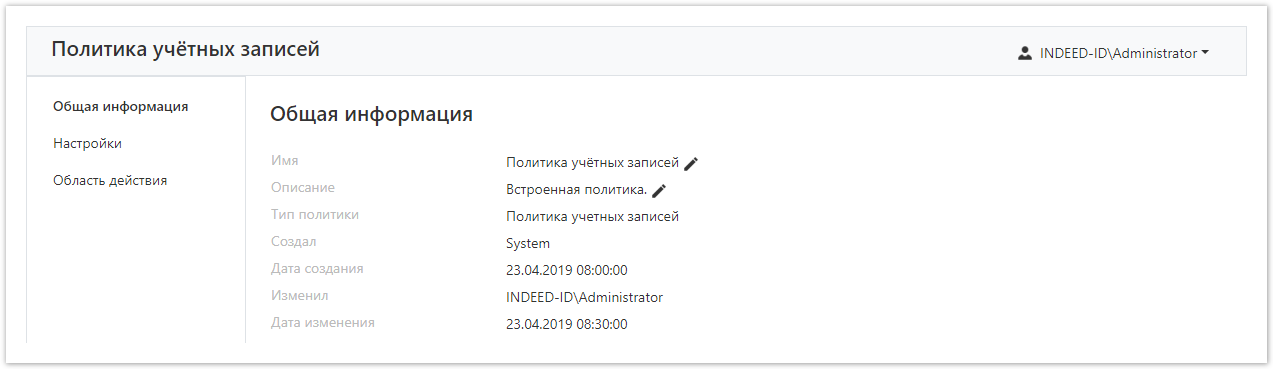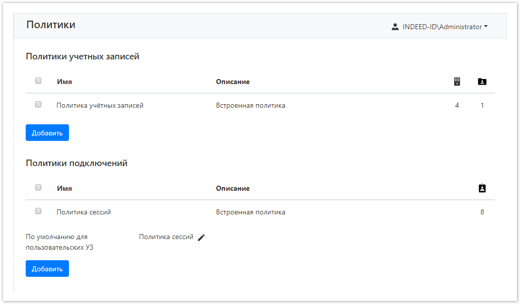 Раздел содержит Политики учётных записей и Политики сессий, позволяет выполнять их просмотр, редактирование, создание и удаление.