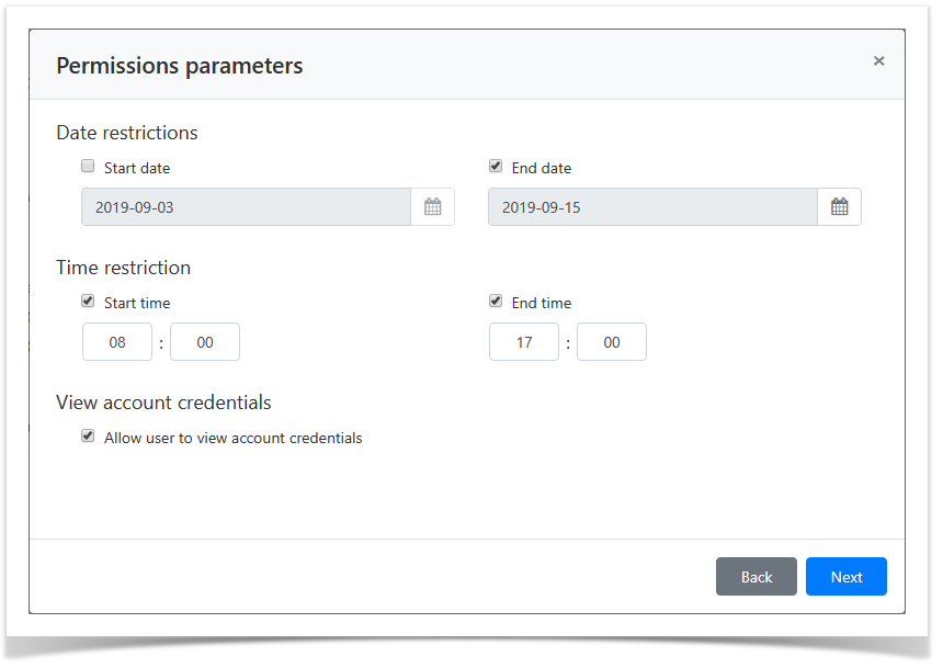 Note icon false If you need to modify the permission parameters, simply click Back to return to the required step.