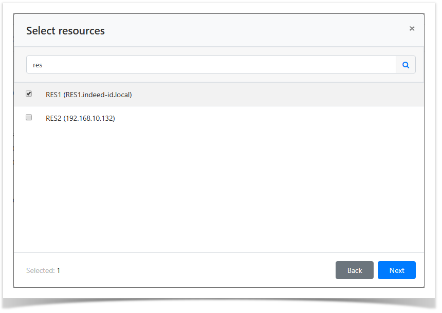 To find account enter Resource name or Address (DNS name/IP address) completely or partially.Note icon false If the permission is created from local account profile, the resource selection step is skipped, since a local account can reside at one resource only. If the permission is created from domain account profile, then all the resources added to Indeed PAM are available for selection.