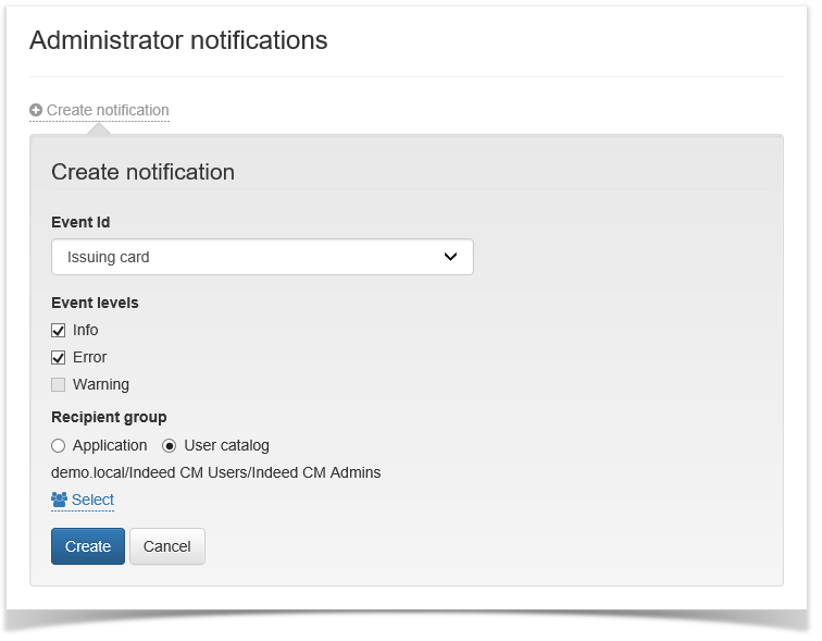 To create a notification, click Create notification, select an event and define the event type, that administrator should be notified of (Information, Error or Warning), define the recipient group and click the Create.