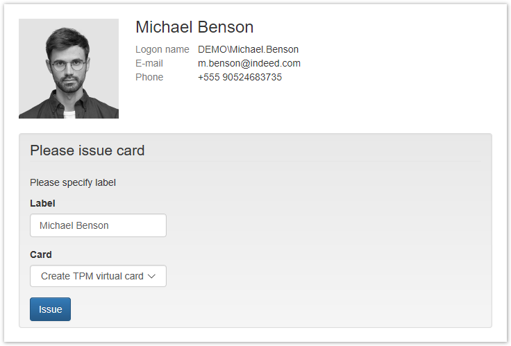 After clicking the Issue button, Indeed Certificate Manager will create a the TPM virtual card and assign it to the user. The TPM virtual card can be used just like hardware smart cards on the user's workstation. For example, for authentication in a domain.