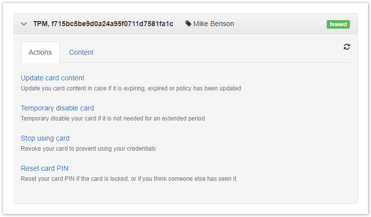 If the user's workstation is equipped with a the Trusted Platform Module 2.0 , then IndeedCM.TPM.Middleware must be installed on the workstation to issue the TPM virtual card.When and TPM virtual cards are allowed in the system configuration when issuing the smart card in Self Service, the user will be suggested to Create TPM virtual TPM card or select a connected hardware smart card:.