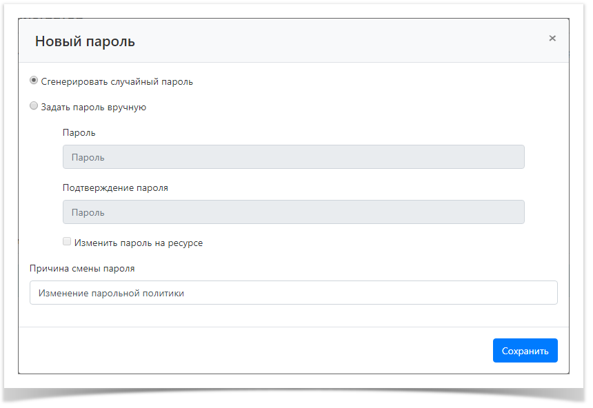 - Заполните поле Причина смены пароля и нажмите Сохранить.