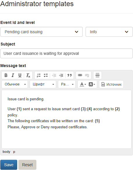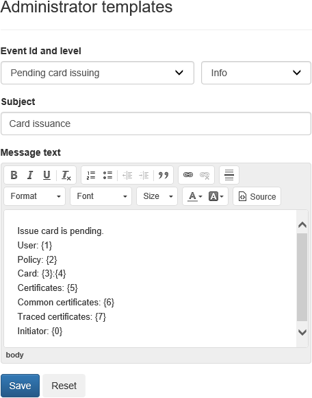 The tab defines the templates of email notifications of Indeed Certificate Manager system events to be sent to system administrators. You can define one template for each notification within a policy of smart card usage.