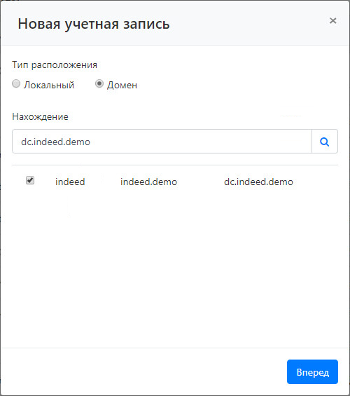 - Выберите тип расположения Домен и выполните поиск домена на котором есть добавляемая учётная запись. По умолчанию выводится список всех доменов. Поиск производится по NetBIOS имени, DNS имени или DNS имени контроллера домена, отметьте нужный домен флажком и нажмите Вперед.