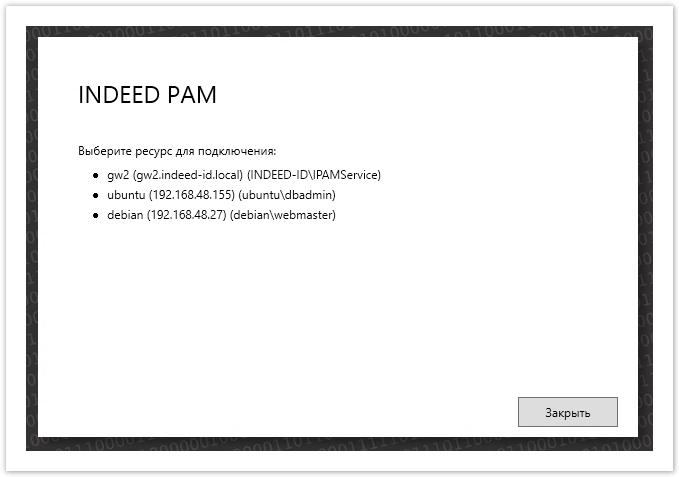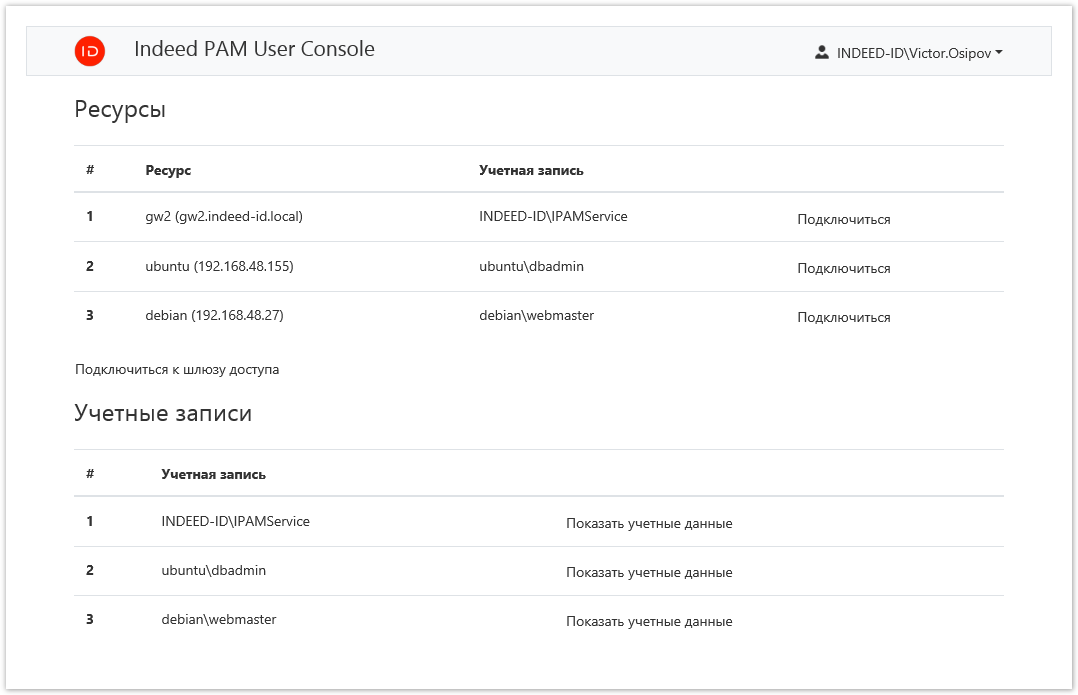 Получение доступа к ресурсам выполняется при помощи специальной оболочки для Indeed PAM Core, консоли пользователя. Доступна по следующему URL: