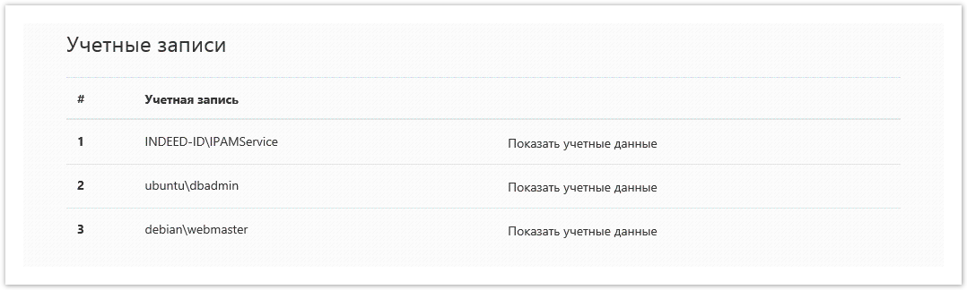 В разделе отображаются все учётные записи, для которых доступен просмотр пароля и SSH-ключа. Для просмотра нажмите Показать учётные данные, введите причину просмотра, нажмите Далее и подтвердите свои действия нажав Показать..