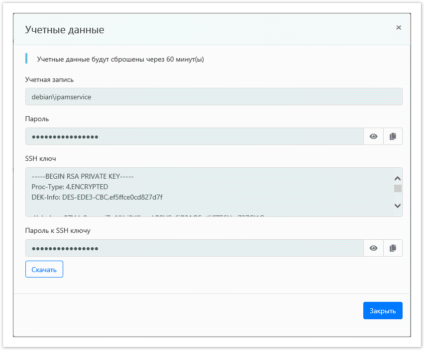 После просмотра пароля или SSH ключа они будут сброшены на случайное значение в соответствии с настройками генерации пароля и настройками времени сброса. |
