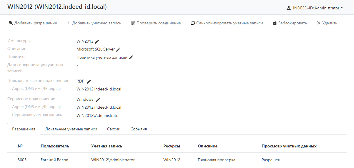 - Ресурсы - ресурсы, на которых может быть открыта RDP, SSH или web-сессия от имени учётной записи, указанной в разрешении.