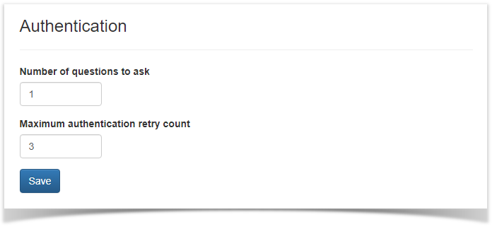 This section defines user authentication parameters: number of security questions for authentication (default value is 2 1) and maximum number of authentication attempts using security questions (default value is 3).