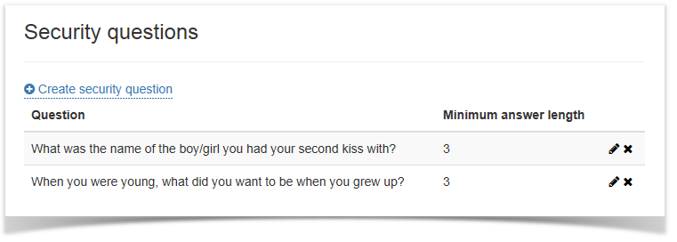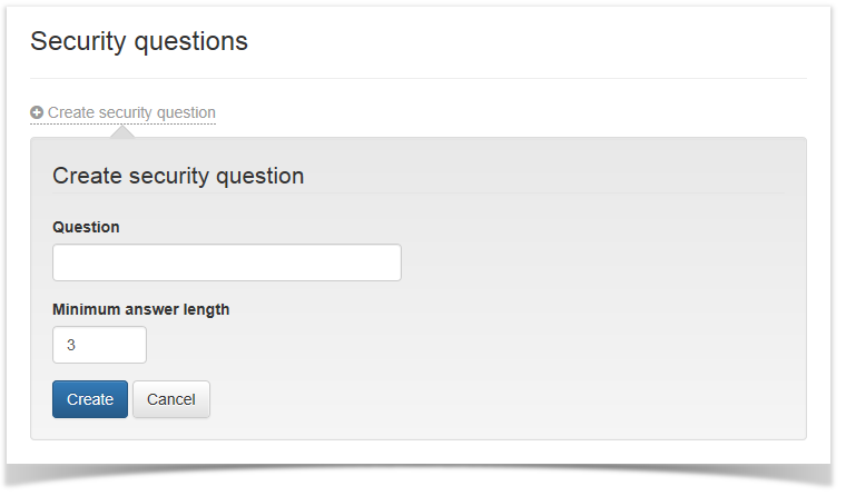 Image RemovedTo define a security question, click Create security question, enter the question text and define minimum answer length (default value is 3 characters). Click Create to store changes.