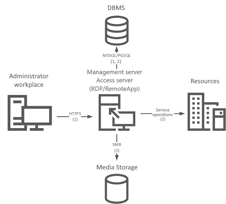 3. Domain authentication and second factor authentication. Checking the user of the IdP database. Checking the permission to access the Core database. Retrieving service account credentials from the DBMS to work with media storage. Retrieving privileged account credentials from the DBMS for connecting to a resource.