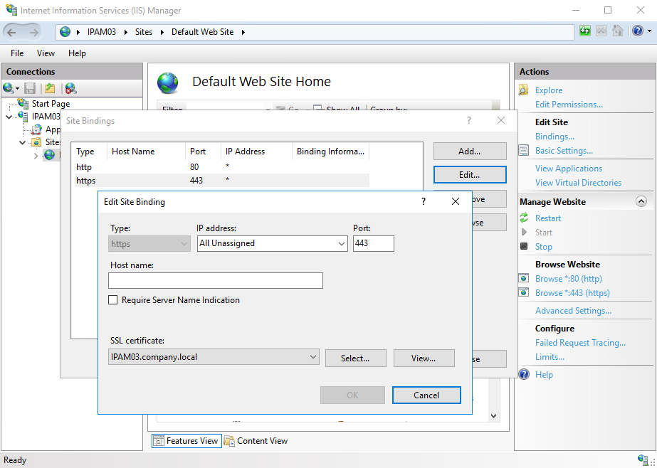 - Click to Restart on the Manage Website section in the Default Web Site window.