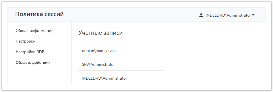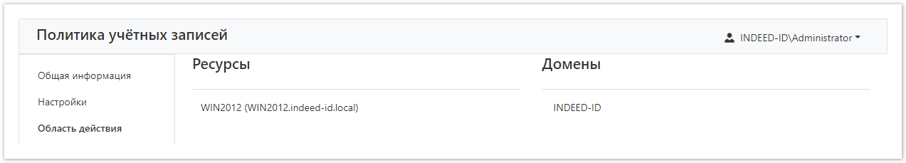 Политика учётных записей распространяет настройки на локальные или доенные учётные записи доступа, назначается на Ресурсы и Домены.