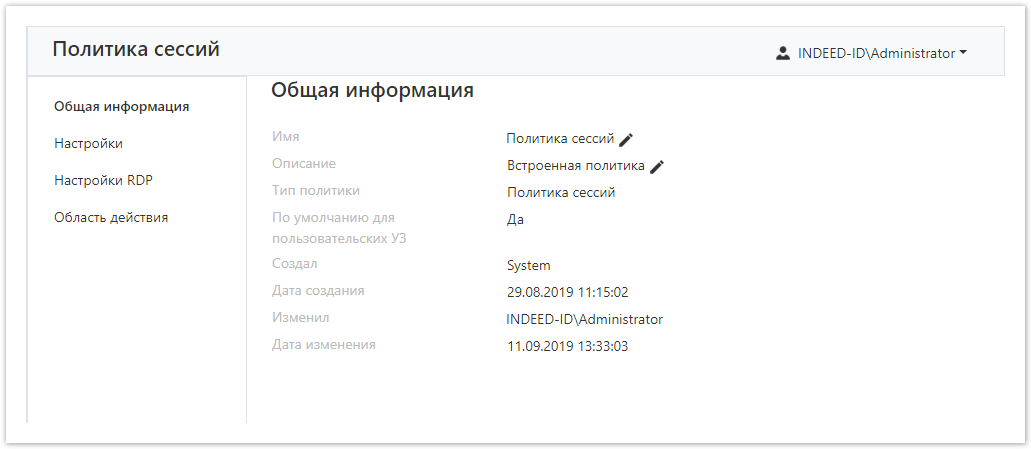 Раздел содержит Политики учётных записей и Политики сессий, позволяет выполнять их просмотр, редактирование, создание и удаление.