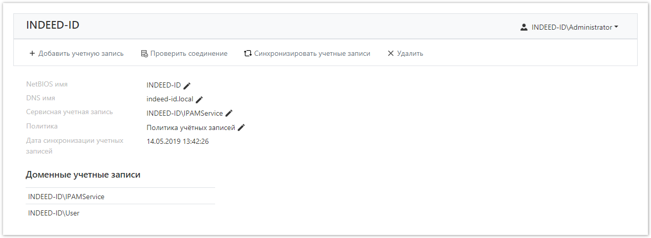 Все добавленные доменные учётные записи отображаются на вкладке Доменные учётные записи.