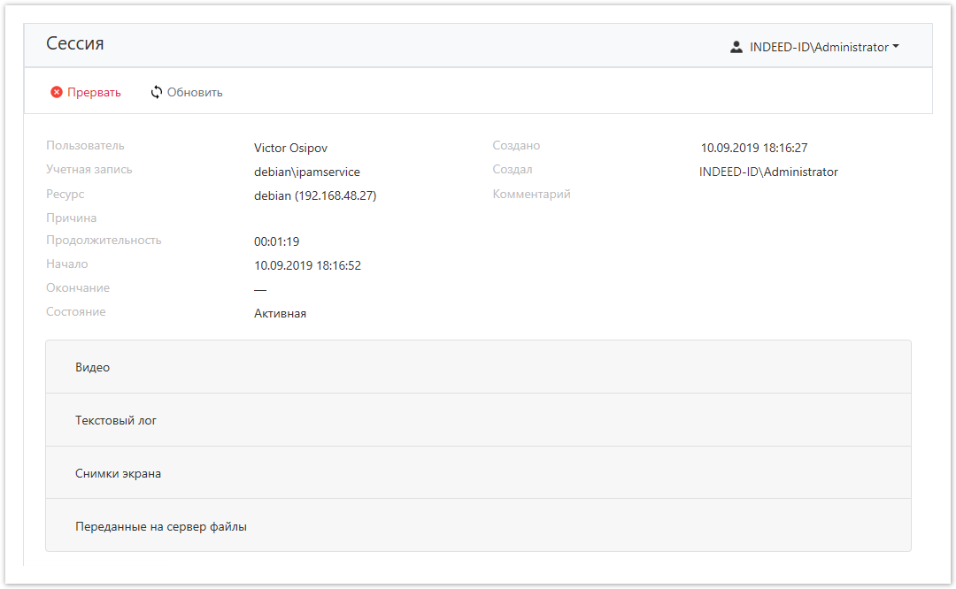 В зависимости от состояния сессии Активная или Завершённая/Прерванная в секции Видео будет отображаться потоковое видео или запись сессии.