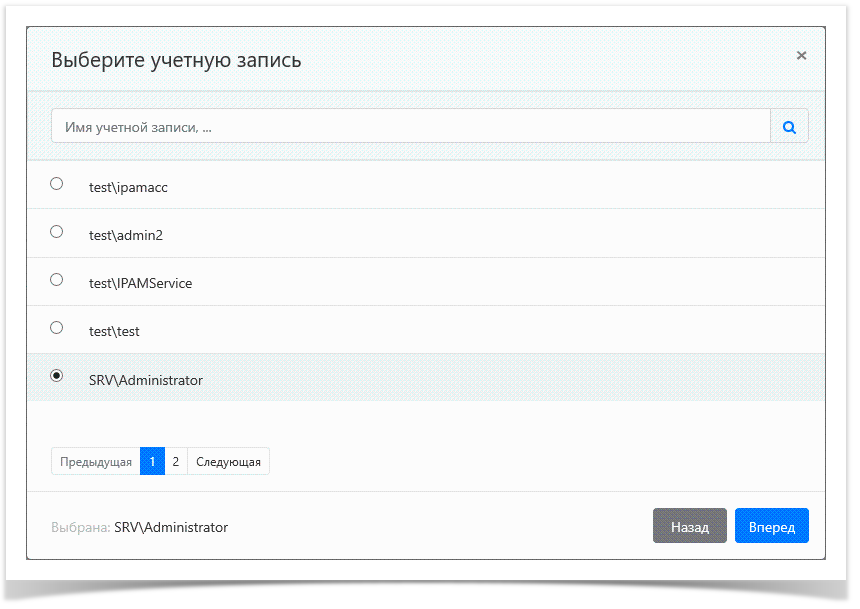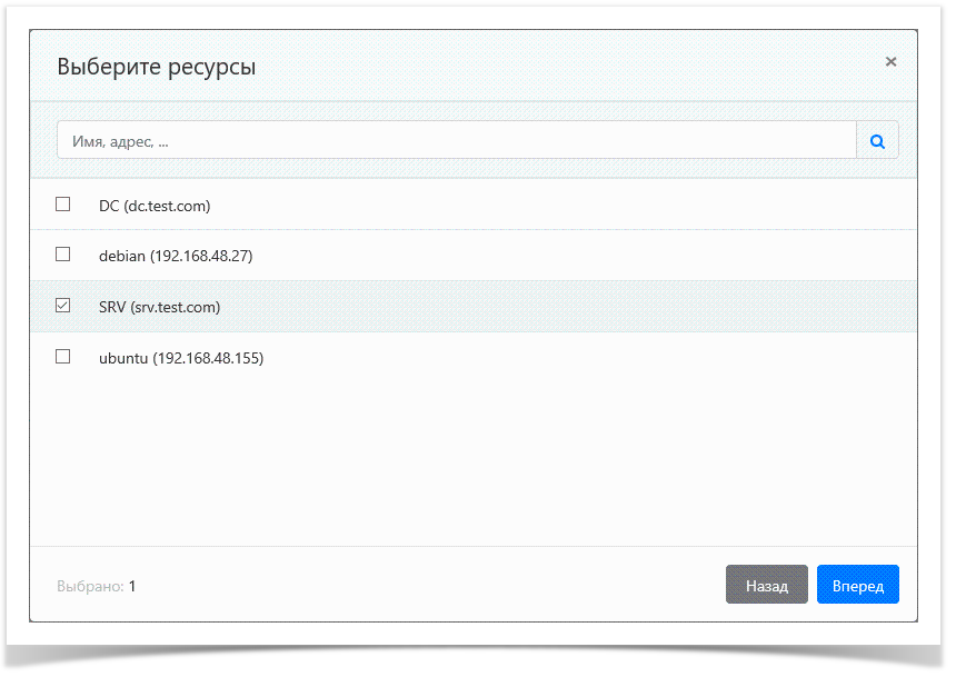 Для поиска введите Имя ресурса или Адрес (DNS адрес/IP адрес) полностью или частично.Если выбрано более одного ресурса, то для доступа к ним будут использоваться только доменные учётные записи. Если выбран один ресурс, то для доступа к нему будут использоваться как локальные учётные записи, так и доменные.
