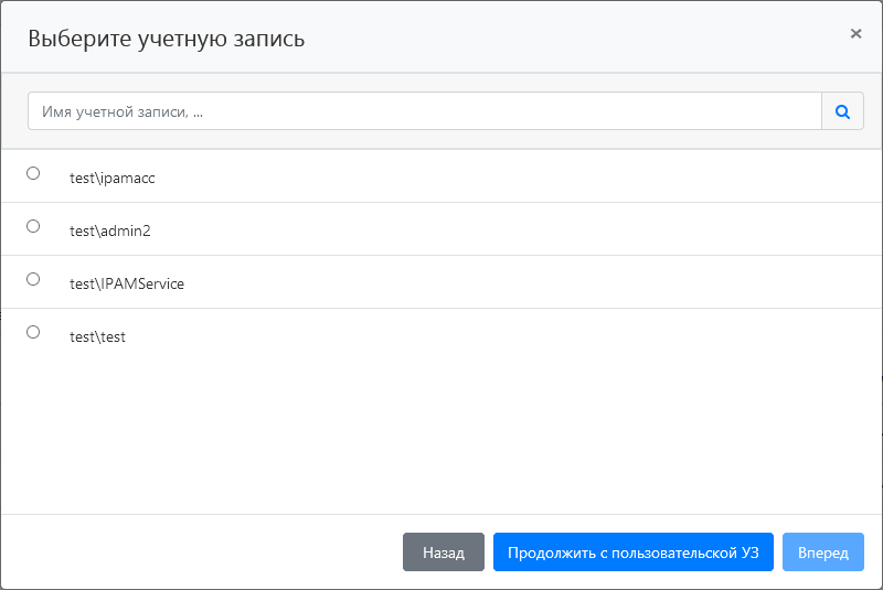 Если выбрано более одного ресурса, то для доступа к ним будут использоваться только доменные учётные записи. Если выбран один ресурс, то для доступа к нему будут использоваться как локальные учётные записи, так и доменные учётные записи.