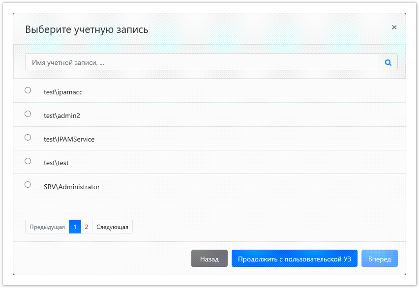 Для поиска введите Имя ресурса или Адрес (DNS адрес/IP адрес) полностью или частично.Если выбрано более одного ресурса, то для доступа к ним будут использоваться только доменные учётные записи. Если выбран один ресурс, то для доступа к нему будут использоваться как локальные учётные записи, так и доменные.