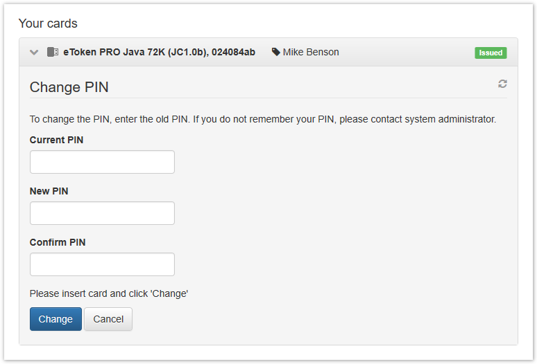In case there is a reason to believe that user card PIN is known to someone else, the user can change the code.