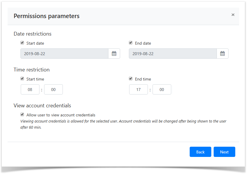 If the user for whom permission is created must have the right to view the password or SSH key of the access account on behalf of which the session will be opened, then check the option Allow user to view account credentials.Viewing account credentials is performed in the Self Service.