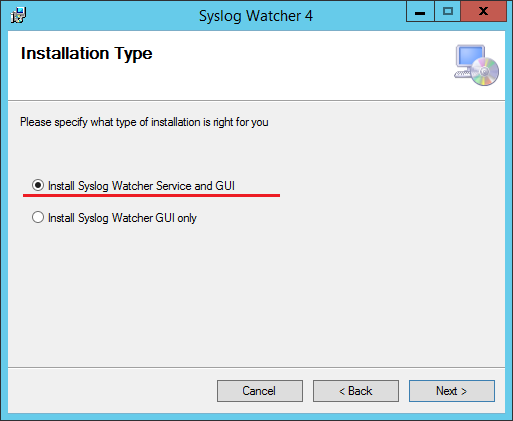 - Select "Install Syslog Watcher Service and GUI” installation type in “Installation type” window.