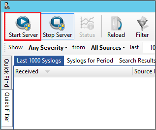 Example<Application Id="ea" SchemaId="eaSchema"> <ReadTargetId>sampleSyslog</ReadTargetId> <WriteTargets> <TargetId>sampleSyslog</TargetId> </WriteTargets> <AccessControl> <!--<CertificateAccessControl CertificateThumbprint="001122...AA11" Rights="Read" />--> </AccessControl> </Application>- Click "Start Server" in the upper left corner of Syslog Watcher application window.