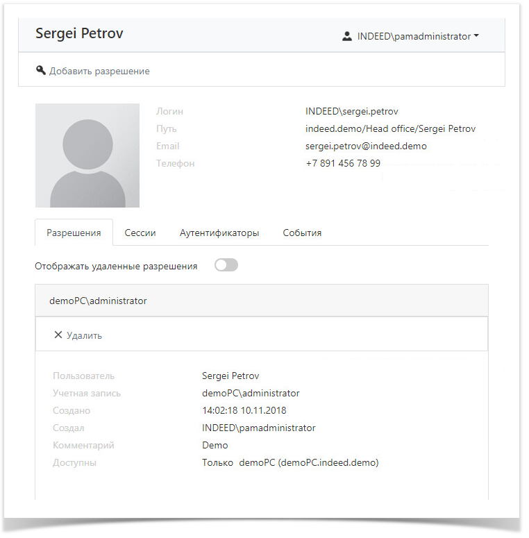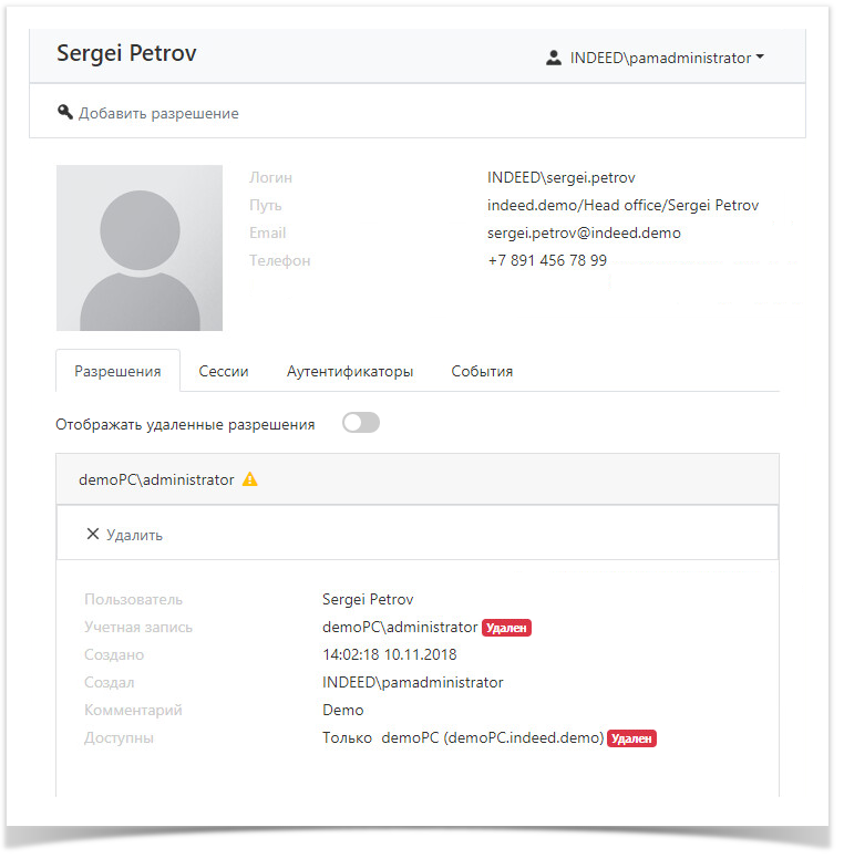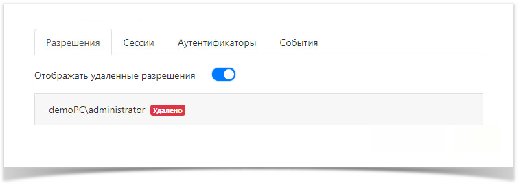 Если необходимо узнать, какие разрешения выдавались пользователю, но были удалены, включите опцию Отображать удаленные разрешения. В списке разрешений отобразятся все удаленные разрешения.