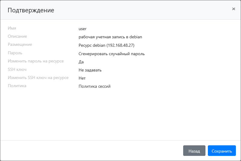 Опции Сгенерировать новый SSH ключ или Задать SSH ключ вручную + Изменить SSH ключ на ресурсе могут быть использованы только при наличии сервисного подключения. Если выбрана опция Задать SSH ключ вручную без Изменить SSH ключ на ресурсе, то SSH-ключ учётной записи будет изменён только в Indeed PAM. |