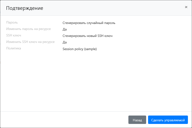 Опции Сгенерировать новый SSH ключ или Задать SSH ключ вручную + Изменить SSH ключ на ресурсе могут быть использованы только при наличии сервисного подключения. Если выбрана опция Задать SSH ключ вручную без Изменить SSH ключ на ресурсе, то SSH-ключ учётной записи будет изменён только в Indeed PAM. |
