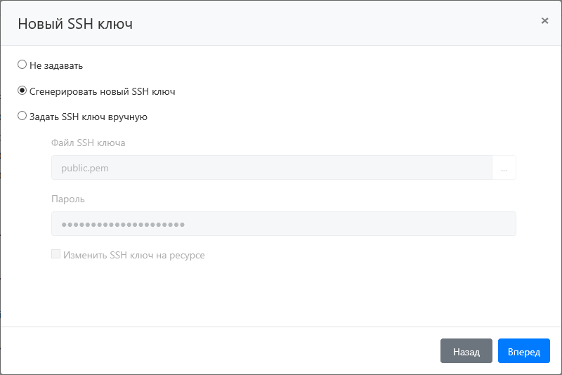 Опции Сгенерировать новый SSH ключ или Задать SSH ключ вручную + Изменить SSH ключ на ресурсе могут быть использованы только при наличии сервисного подключения. Если выбрана опция Задать SSH ключ вручную без Изменить SSH ключ на ресурсе, то SSH-ключ учётной записи будет изменён только в Indeed PAM. |