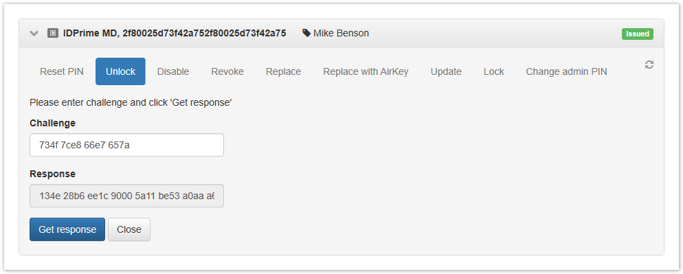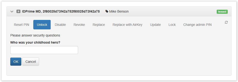 The system administrator opens the user card and selects Unlock item from the list of actions. Before generating the response code for card unlocking, the administrator has to ask security question (or several questions, depending on the policy settings) and enter the user response to the form.