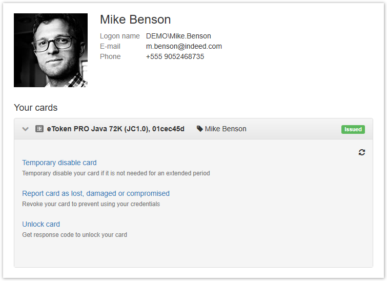 The application is intended to perform operations with a smart card without connecting it to the user computer. It is available at https://<Indeed CM server address>/icmremote and can be published in order to provide for access from Internet. To use Remote Self Service, a user has to specify his or her name and characters from captcha.