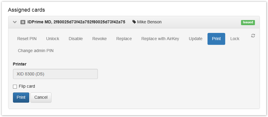 If Enable card printer support is enabled in the smart card usage policy, then card issuance in the Indeed Certificate Manager can be combined with printout of image or text on the card. In this case the card is placed into printer source tray and the card gets certificates written and image printed on according to the defined print template while being issued.